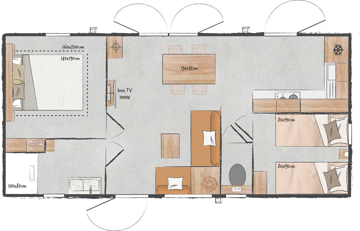 - Tous les Mobil-homes sont équipés d’une télévision et de moustiquaires dans les chambres.